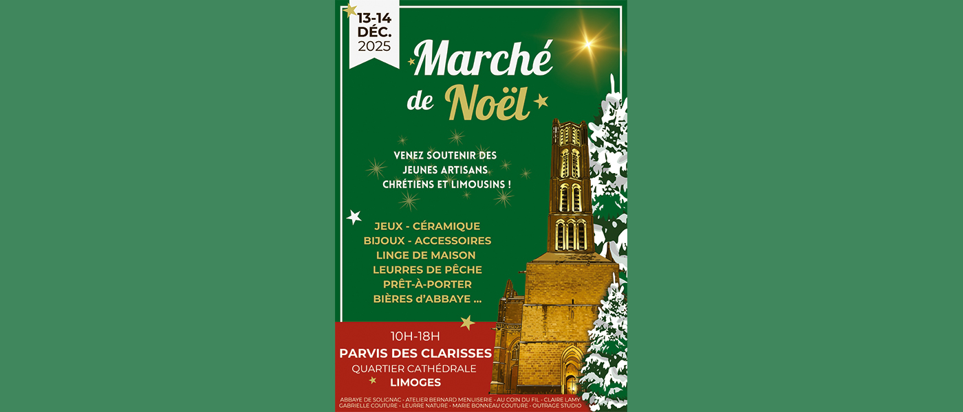 Après le succès du marché de Noël 2024, les jeunes artisans chrétiens limousins lancent une seconde édition les 13 et 14 décembre 2025. Rendez-vous au Parvis des Clarisses, place Saint-Étienne, à Limoges, de 10 h à 18 h.